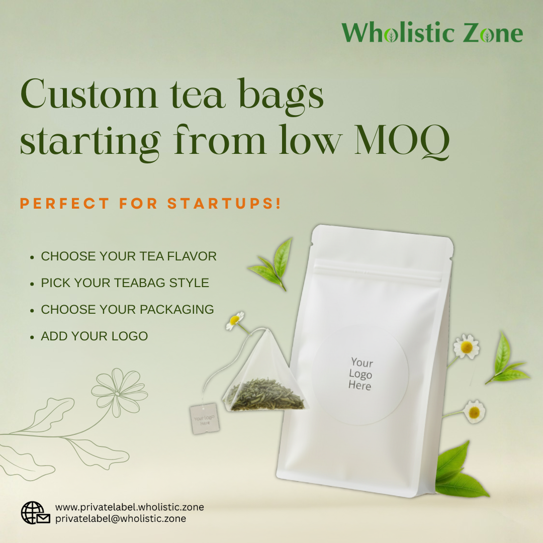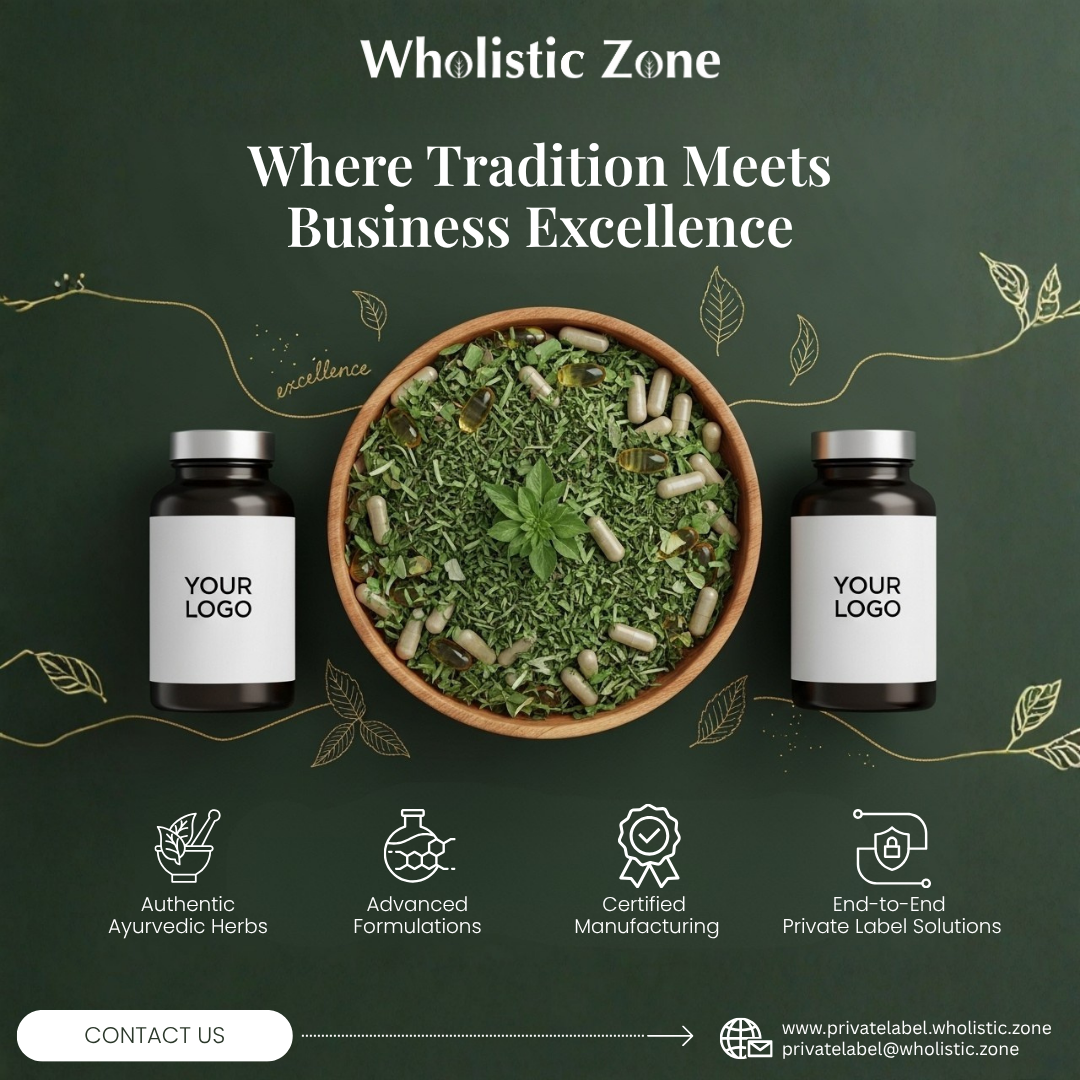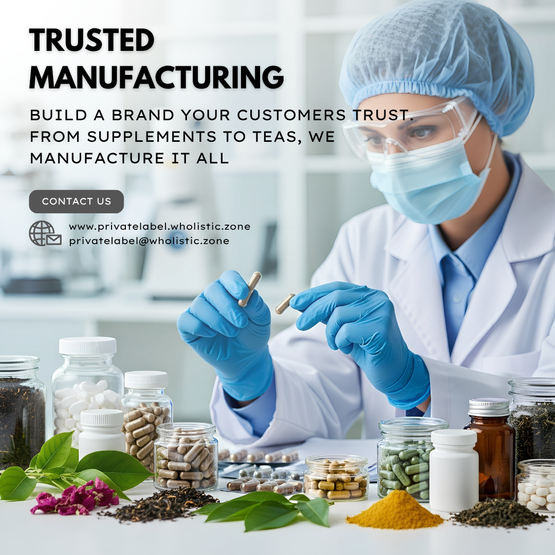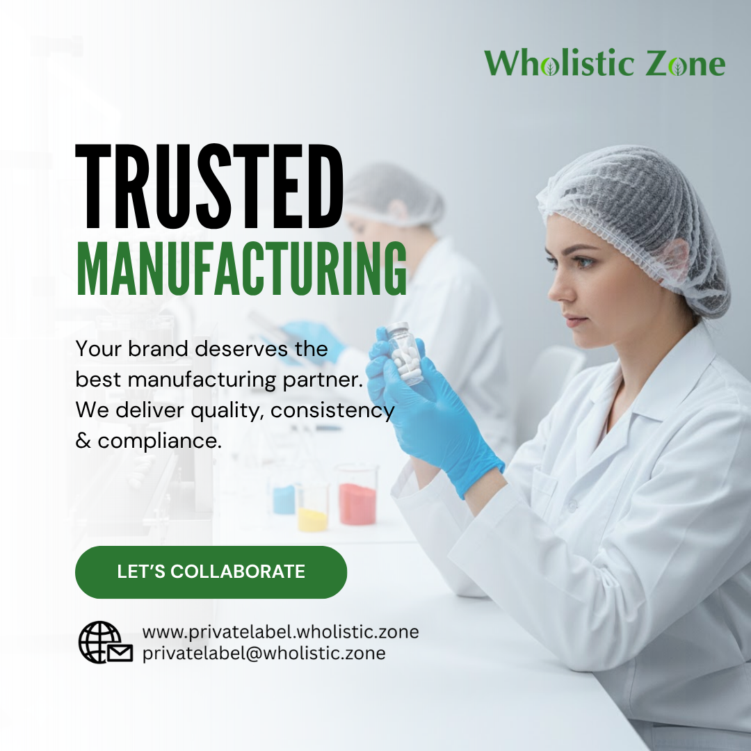 Wholistic Zone is a B2B private label manufacturer specializing in supplements, herbal teas, nutraceuticals, beauty products, cosmetics, and essential oils. As a trusted contract manufacturer and white label supplier, we provide end-to-end services — including custom supplement formulation, capsule, gummy, powder, tea bag, and cosmetic manufacturing, packaging, label design, and R&D — delivering GMP-certified, GMP-certified manufacturing solutions for wellness and beauty brands